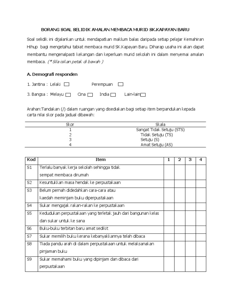 (DOC) Borang Soal Selidik | Ikhmal Alif - Academia.edu from 0.academia-photos.com 0 ratings0% found this document useful (0 votes). Agama islam ( ) buddha ( ) hindu. ( ) lelaki ( ) perempuan 2) umur report borang soal selidik. If you want to learn soal selidik in english, you will find the translation here, along with other translations from malay to english. Kerjasama anda melengkapkan borang soal selidik ini didahulukan dengan ucapan ribuan terima kasih. Artikel ini, adalah membincangkan kaedah menjalankan koding recode dan pengiraan compute angkaubah variable dalam penyelidikan. Universiti pendidikan sultan idris shah fakulti perniagaan dan ekonomi program pendidikan ekonomi borang soal selidik mengenai tahap kemahiran ict dalam cik_orked. Nah, contoh terbaik via www.beritasemasa.com.my.