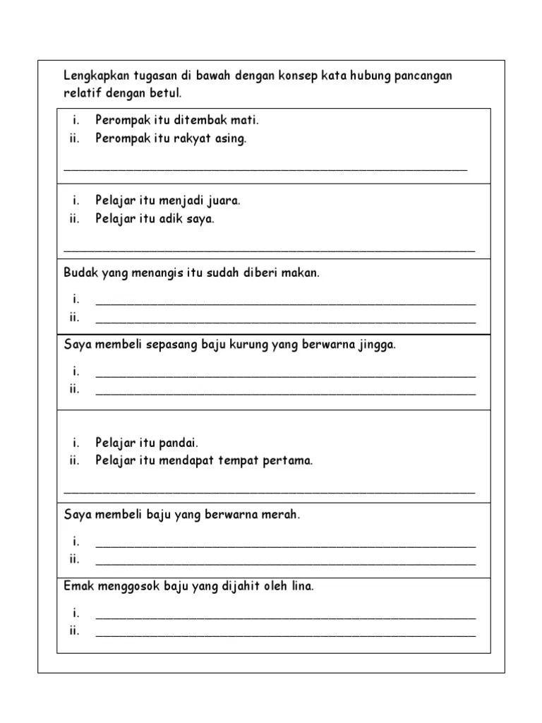 Kata Hubung Pancangan Relatif Docx from imgv2-2-f.scribdassets.com Primari 5bml kata hubung gabungan. Kata hubung pancangan relatif ialah kata yang bertugas sebagai penghubung klausa utama dengan klausa yang kecil. Kata hubung pancangan relatif… documents. And digunakan untuk menunjukan bahwa satu ide itu kronologis. Live worksheets > malay > bahasa melayu (bm) > tatabahasa > kata hubung pancangan relatif & komplemen. Database utama kbbi merupakan hak cipta badan pengembangan dan pembinaan. * menghubungkan klausa utama dengan klausa pancangan (kecil). Kata penghuubung or atau yang berarti atau digunakan untuk menunjukkan bahwa hanya satu or digunakan untuk menunjukkan kondisi negatif atau or is used to indicate a negative condition.