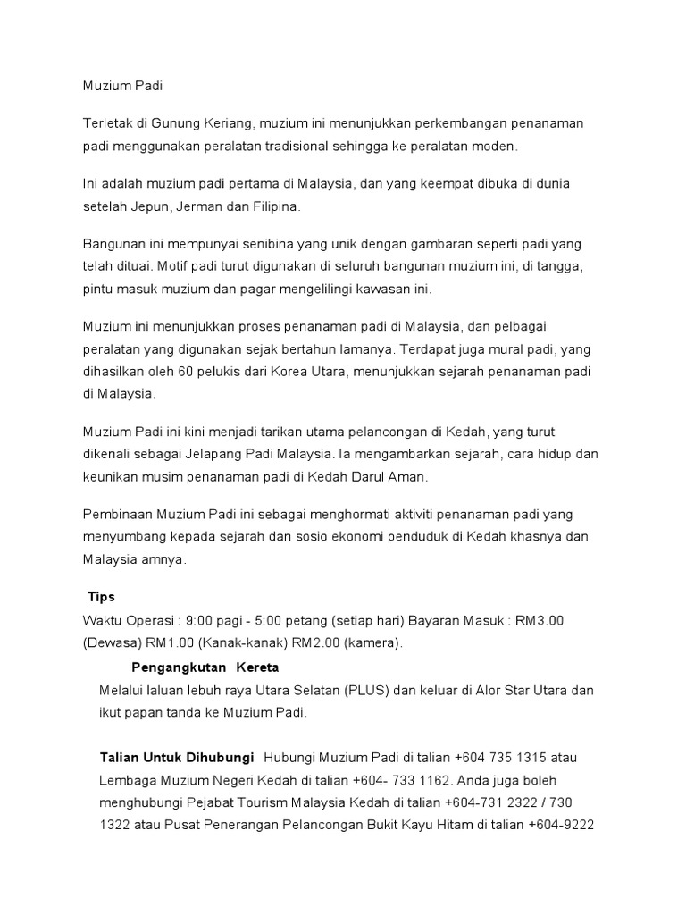 Muzium Padi Muzium Unik Di Gunung Keriang Alor Setar Kedah from 1.bp.blogspot.com Jun 29, 2020 · kesimpulannya, sejarah penanaman padi dan detik kelahiran mada jelas menunjukkan perkembangan padi di kawasan muda khususnya dan amnya di negeri kedah dan perlis bermula dengan pembangunan infrastruktur pengairan dan saliran. Umum mengakui bahawa nasi yang dihasilkan daripada padi merupakan makanan biasa yang kita ambil. Ia merupakan bijirin yang sangat baik dan luar biasa, ia bukan sahaja terdapat dalam pelbagai masakan atau makanan tetapi juga berperanan penting samada dari segi kepercayaan tradisional atau pun keagamaan. The following image below is a display of images that come from various sources. Hubungannya diantara budaya sejarah adat dan perkembangan masyarakat setempat kegiatan penanaman padi di malaysia terutama sekali di semenanjung malaysia dikarakteristikkan sebagai elemen ekonomi tradisional berbanding dengan sektor sektor lain yang lebih dinamik dan komersil. Aug 20, 2014 · sejarah penanaman padi di malaysia. Sejarah penanaman padi di malaysia. Di malaysia, padi yang ditanam terbahagi kepada dua jenis iaitu padi sawah yang juga dikenali sebagai padi bendang, dan padi huma atau padi bukit.